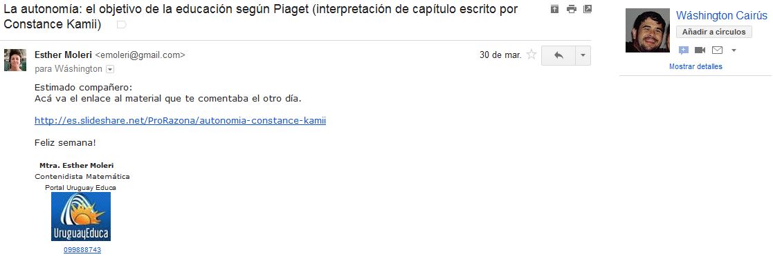 Solicita que le envíe por correo el material de Autonomía intelectual de Kamii.